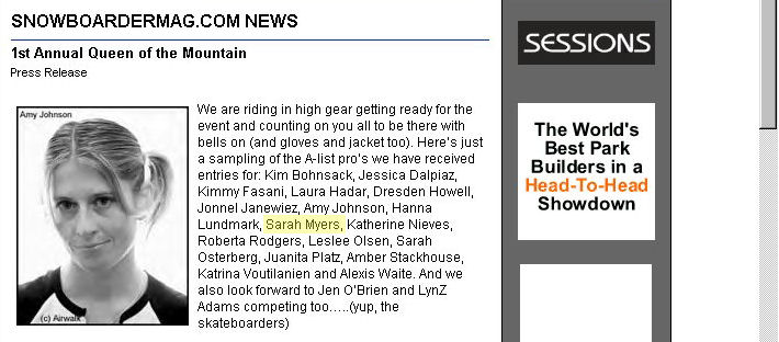 Action and Media archives of former professional snowboarder Sarah Myers. Sarah Myers grew up in the Tahoe area near Incline Village, NV, and Truckee, CA. Other names:Sarah Miller